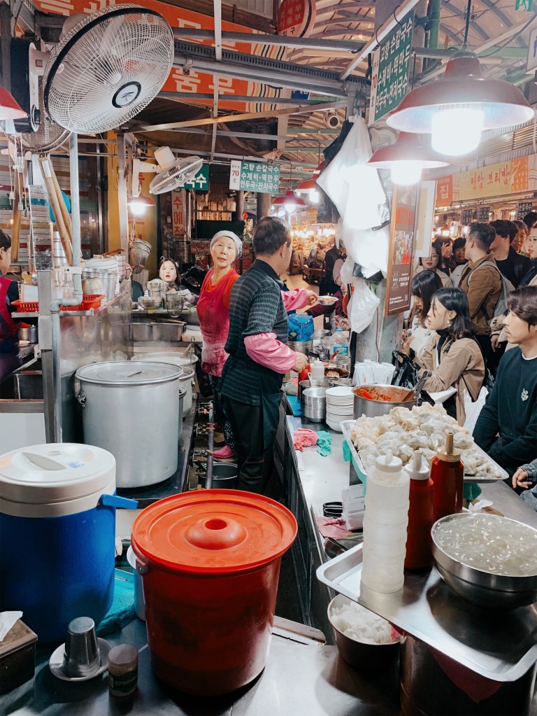 –– Of course, you should visit several food stalls at the market, but Yoonsun Cho, who runs this stall, makes incredible dumplings and her knife cut noodles are famous. She is even featured on Netflix’s Street Food episode 6.