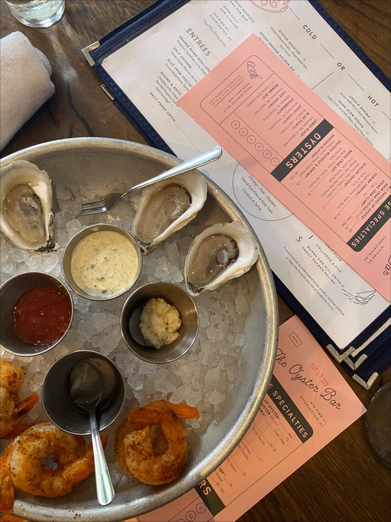 We had reservations at 4pm for The Darling Oyster Bar (and I highly recommend making a reservation to guarantee a seat! Even the bar filled up very quickly!) We had a few cocktails (I tried the Spritz Carlton + Basil Daisy), some oysters and shrimp cocktail from the raw bar, and a fry basket with shrimp + hushpuppies. The food, atmosphere, and service were excellent!