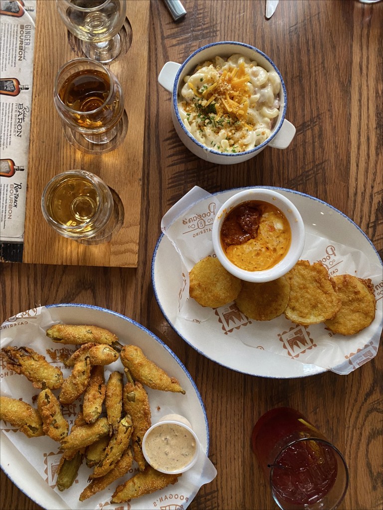 APPETIZERS: Fried Green Tomatoes with bacon jam and pimento cheese (to DIE for!!), Mac & Cheese with country ham and cornbread crumbs, and Fried Okra.